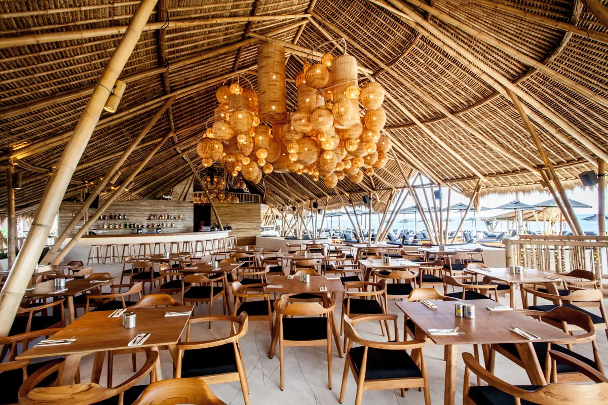 Finns Beach Club dikenal dengan desain arsitektur yang modern namun tetap menyatu dengan nuansa tropis. Bangunan yang didominasi bambu dan material alami memberikan sentuhan hangat sekaligus mewah. Area terbuka yang luas membuat setiap pengunjung bisa merasakan angin laut yang sejuk dan panorama Samudra Hindia.
